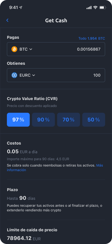 Por ejemplo, como inversionista, usted compra BTC por 10 000 EUR. Estos 10 000 EUR quedan bloqueados hasta que venda el BTC (quizás después de que suba el precio). Este es precisamente el momento en el que Get Cash resulta muy útil. El inversionista puede acceder a una parte del valor de mercado de sus criptomonedas, utilizarlo para cualquier propósito y, posteriormente, devolver la cantidad de Get Cash y recuperar la cantidad exacta de criptomonedas. Al final, el resultado es el mismo que con una inversión clásica, pero como inversionista puedes utilizar el valor de tus fondos en criptomonedas durante el proceso.